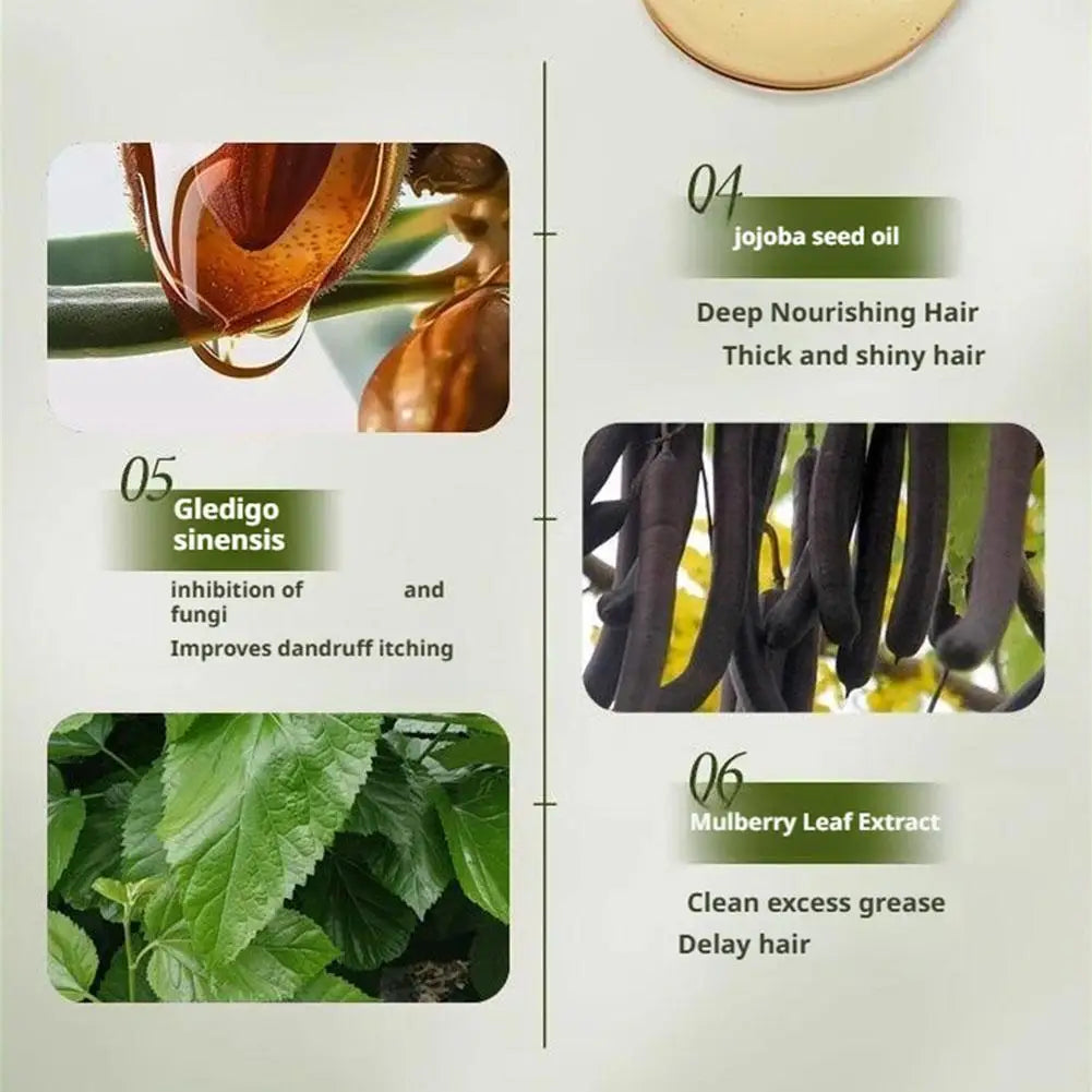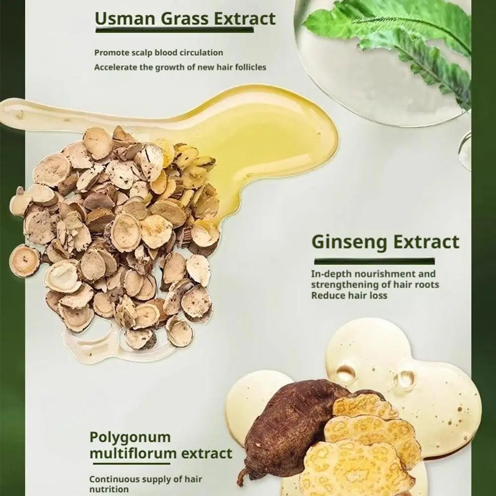 1. Natural herbal formula, containing plant extracts such as Platycladus orientalis, Polygonum multiflorum, and Usmanthus sinensis, gently nourishes the scalp and improves hair loss.
